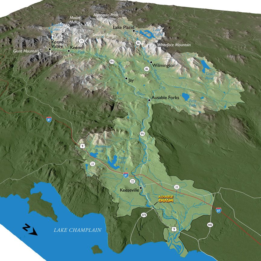 3D oblique map prepared for LCBP/Ausable Chasm interpretive exhibit panel. Click for larger version.